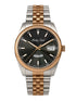 Silver-tone 316L stainless steel case with a two-tone (silver-tone and rose gold-tone) stainless steel bracelet. Fixed rose gold-tone stainless steel bezel. Black dial with rose gold-tone hands and index hour markers. Minute markers around the outer rim. Dial Type: Analog. Date display at the 3 o'clock position. day of the week display at the 6 o'clock position. Ronda Caliber 517 quartz movement. Scratch resistant sapphire crystal. Pull / push crown. Solid case back. Round case shape, case size: 41 mm. Water resistant at 50 meters / 165 feet. Functions: date, day, hour, minute, second. Mathy Day-date Series. Watch label: Swiss Made. Mathey-Tissot Mathy Day-Date Quartz Black Dial Men's Watch H510RS.